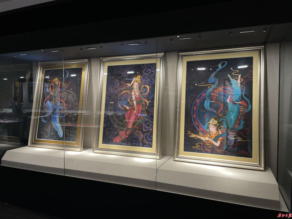 青铜生肖砚、铁骨铮铮傲雪砚、端溪砚坑揽胜图砚……展馆内从墙上到橱窗,分别展示了不同花式及形态的端砚及端砚拓片。无论是直观可见的立体砚石雕刻图景,还是拓印在画纸上的平面画像,都将“画”中美物美景生动呈现。走进展馆另一侧的广府金绣展区,金光熠熠的金绣画作闪耀室内,随着光影的变化而呈现灵动之态,不由吸引观展者驻足打量。
