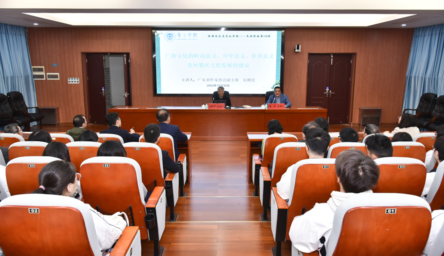 11月16日,广东省政府文史馆馆员、广东省作家协会副主席丘树宏做客旅游学院文旅讲坛,主讲“广府文化的肇庆意义、岭南意义、中华意义、世界意义及对肇庆市文旅发展的建议”专题讲座。旅游与历史文化学院书记杨雪梅出席,旅游学院副院长周军主持。
