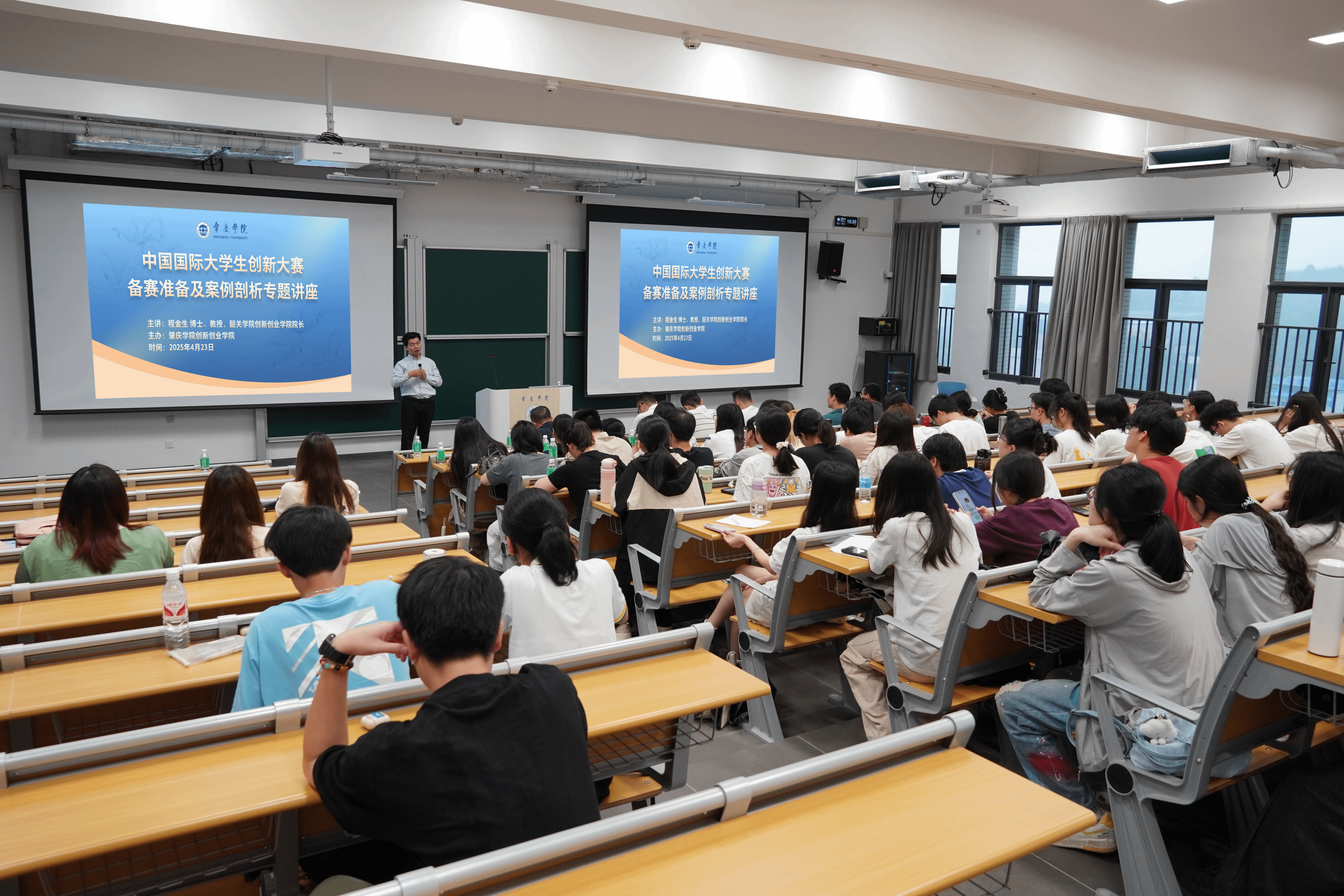 本网讯 4月23日,创新创业学院邀请多届中国国际大学生创新大赛国赛评委、韶关学院创新创业院长程金生教授到校开展专题讲座,以“中国国际大学生创新大赛备赛准备及案例剖析”为主题作分享。各二级学院负责创新创业工作的教师、创新创业教育菁英班学员、砚园创谷入驻团队等近百名师生参与。讲座由创新创业学院院长唐文武主持。